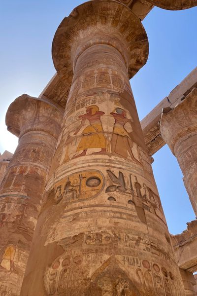 In Karnak Templeโthe worldโs largest religious complexโweโll see the wall of Shoshenq I (biblical Shishak), revealing his conquests in Israel after Solomonโs death. Some 2.7 km away, along the Avenue of the Sphinxes, weโll also see the impressive Luxor Temple.