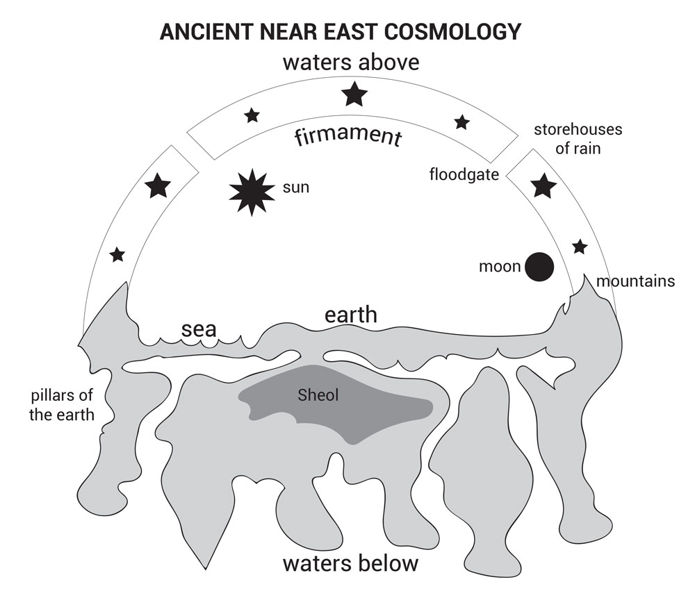 Haarsma claims to endorse contextual exegesis. Her main exegetical conclusion? Genesis 1 assumes a ‘flat earth, solid sky’ physical cosmology (figure 1). But her point isn’t exegetical; it’s about hermeneutical method. She’s saying that God didn’t correct their “pre-scientific” (i.e. false) cosmology (pp. 130–132).