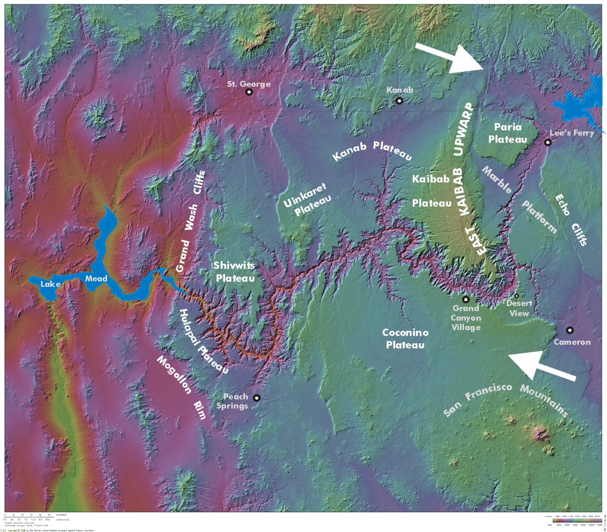 “Any such lake [southeast of the Kaibab Plateau], even if it were as deep and really extensive as would be needed, seems more likely to have drained to the north and south of the modern canyon in avoidance of the structurally high crest of the Kaibab arch … .”14
