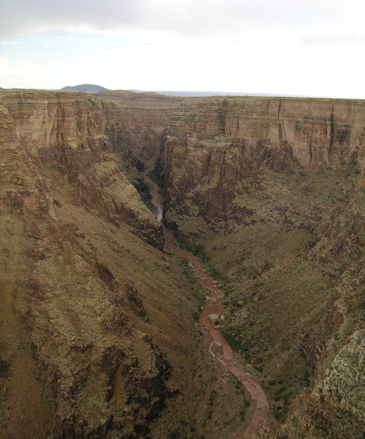 There are numerous other problems with the spillover idea.35 Some researchers have pointed to the Bidahochi Formation in the northeast part of the basin of the Little Colorado River as evidence of a past large lake, ‘Lake Hopi’, southeast of Grand Canyon.36 However, most researchers consider this formation to be mostly volcanic and ‘fluvial’; the lake part of the formation is a small part of the formation and is considered deposits from a small, playa lake.37 If there was a giant Lake Hopi, erosion of the commonly soft sediments in the area should have filled up the basin with bottom sediments tens to hundreds of metres deep before the breaching of the Kaibab Plateau. There is no way to erode these sediments during any supposed lake spillover because the exit of Lake Hopi, the Little Colorado River Canyon just southeast of Grand Canyon, is a slot canyon up to about 1 km deep (figures 4 and 5). Such a narrow canyon could not produce strong enough currents to have eroded the bottom sediments out of the basin (figure 6).